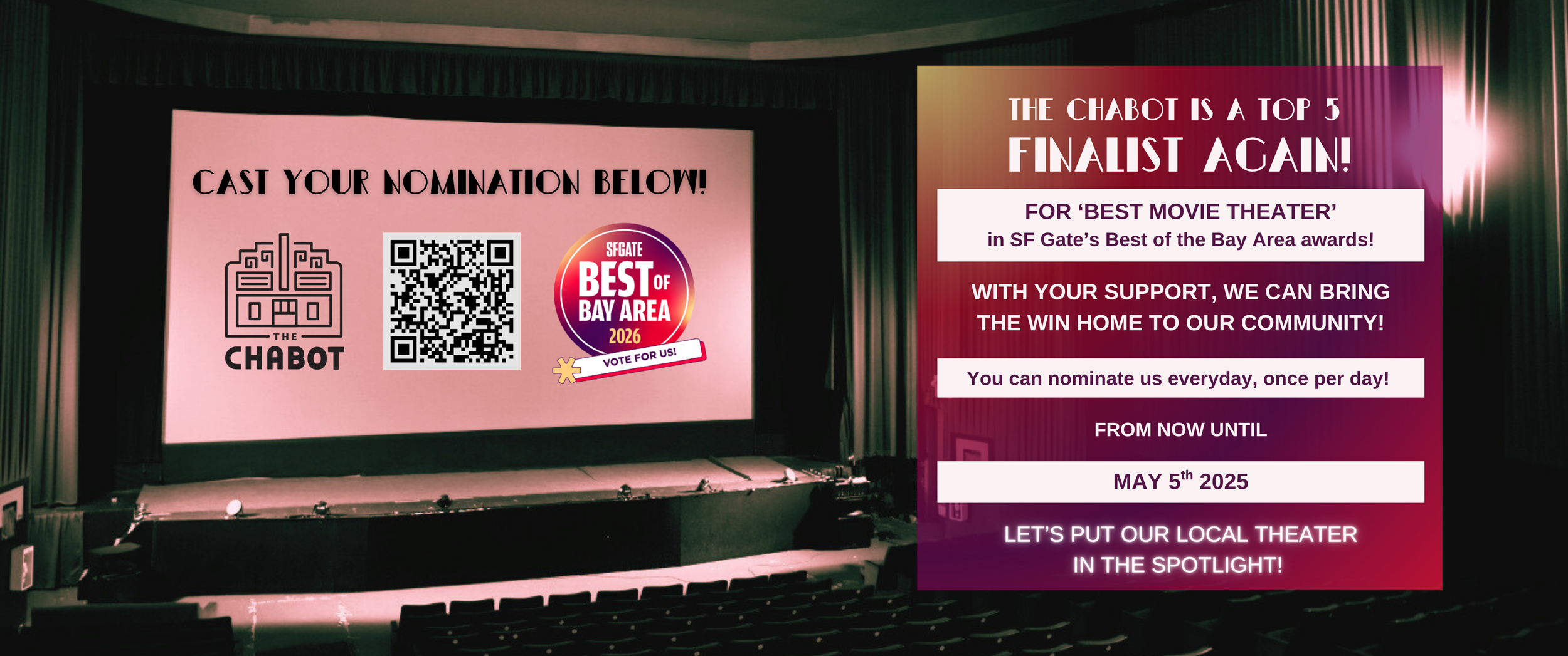 The Chabot is available for private rentals and events! Renting the theater for a private event is a wonderful way to support the theater. Be sure to consider our historic venue for your next function.