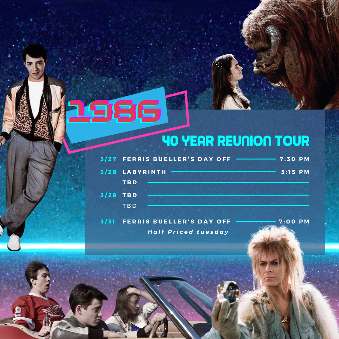 40 year reunion tour ferris bueller’s day off (1986)friday, march 27 7:30 PM saturday, march 28 8:00 PM half priced tuesday, march 31 $6 TICKETS AT 7:00 PM LABYRINTH (1986)SATURDAY, march 28 5:15 PM LITTLE SHOP OF HORRORS (1986)SUNDAY, march 29 2:00 PM PRETTY IN PINK (1986)SUNDAY, march 29 4:45 PM new & coming soon join our mailing list! Sign up with your email address to receive news and updates about movie releases and events! Email Address Sign Up We respect your privacy. Thank you!